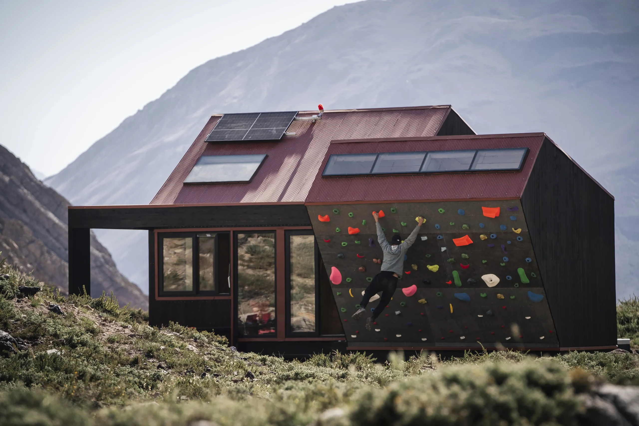 ambos volúmenes están desplomados, dejando una espacialidad amplia en su interior y 2 muros de escaladas en sus caras exteriores para que los visitantes puedan practicar deporte durante su estadía.